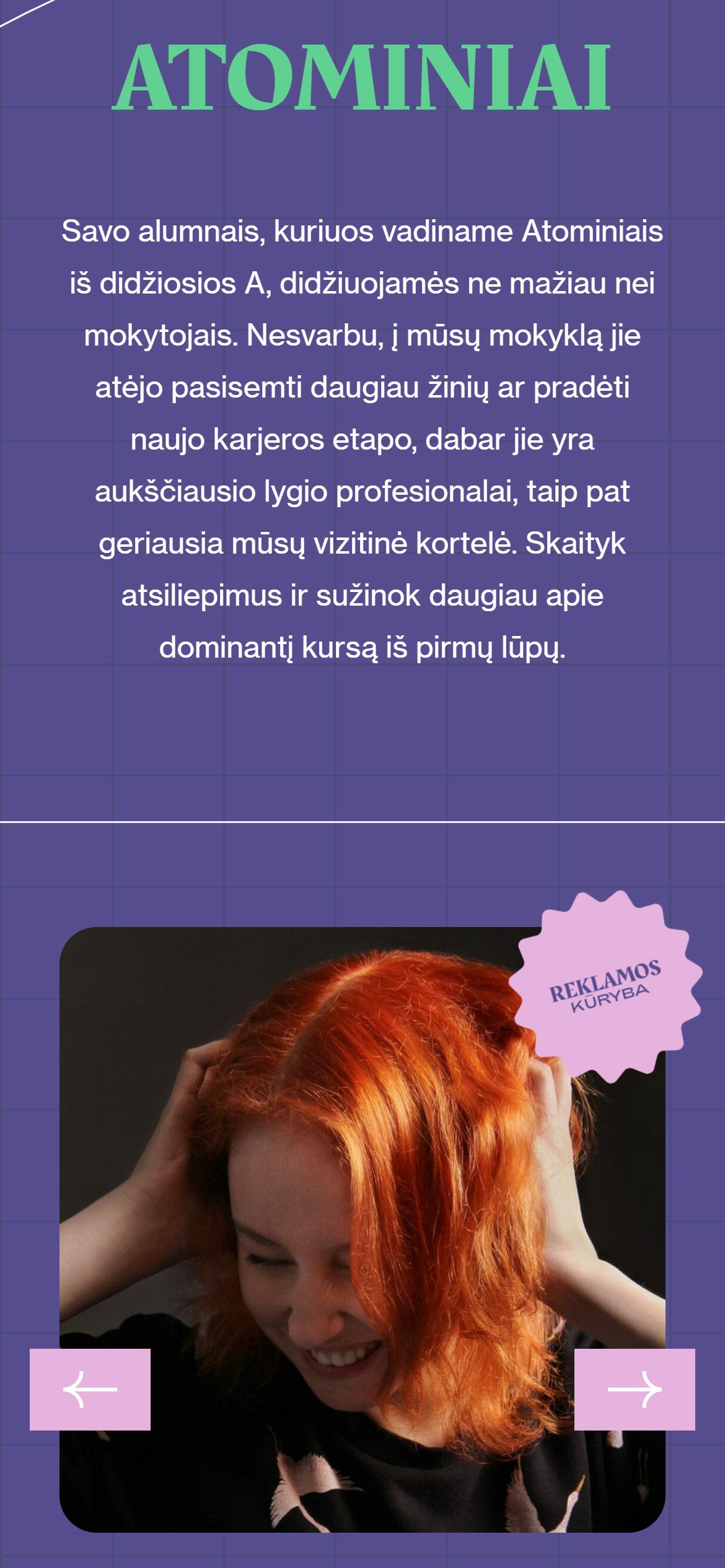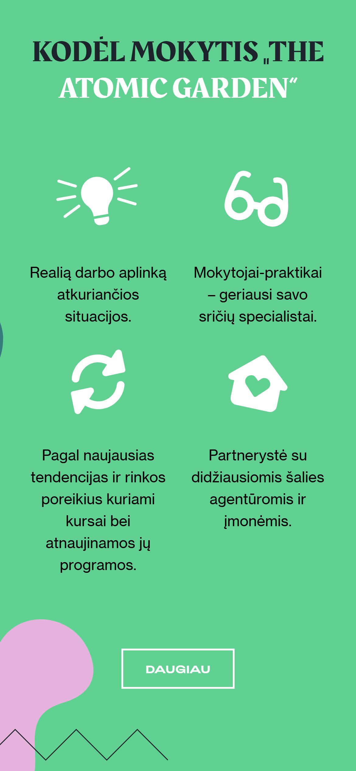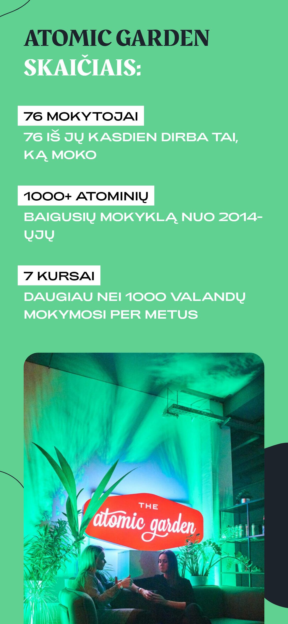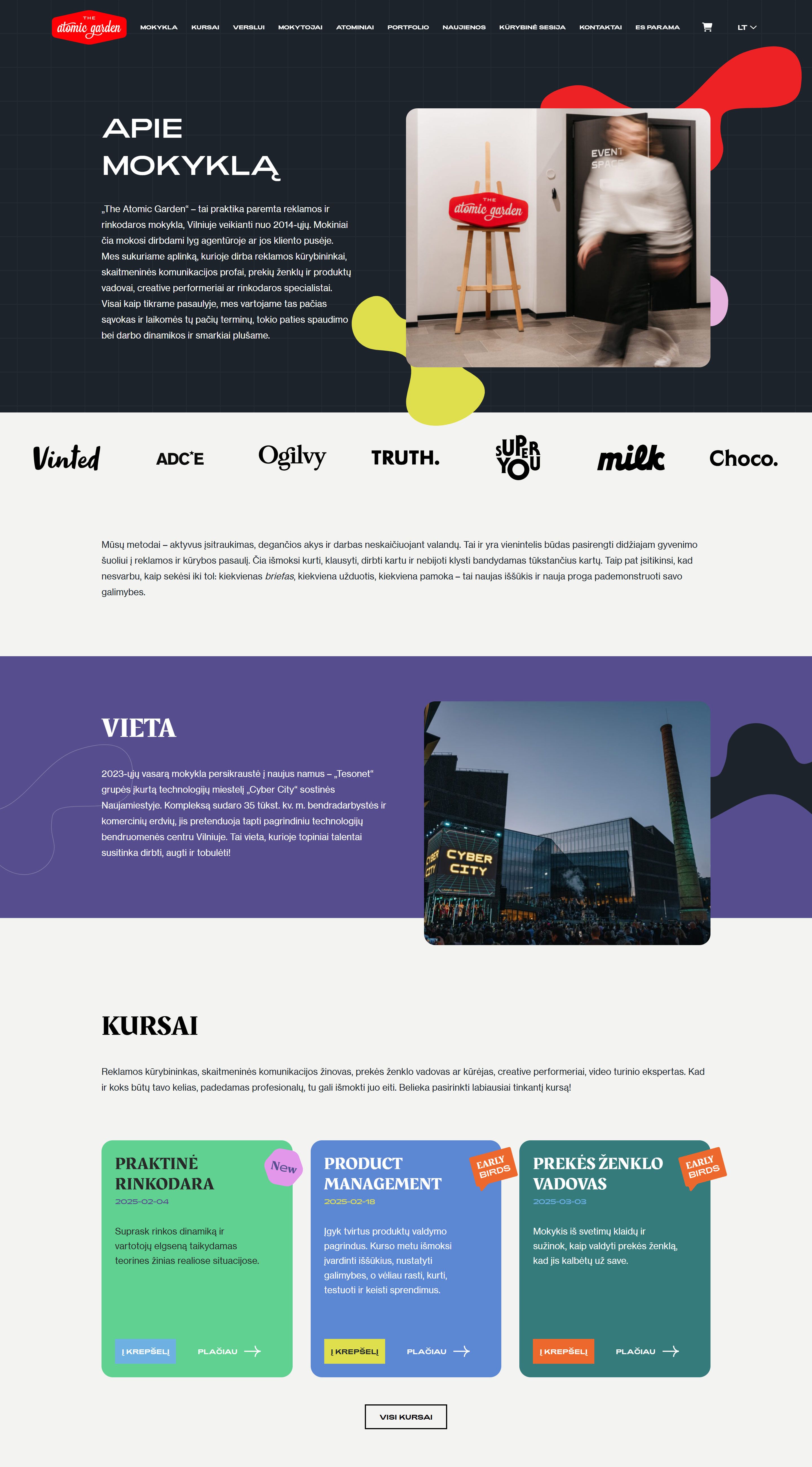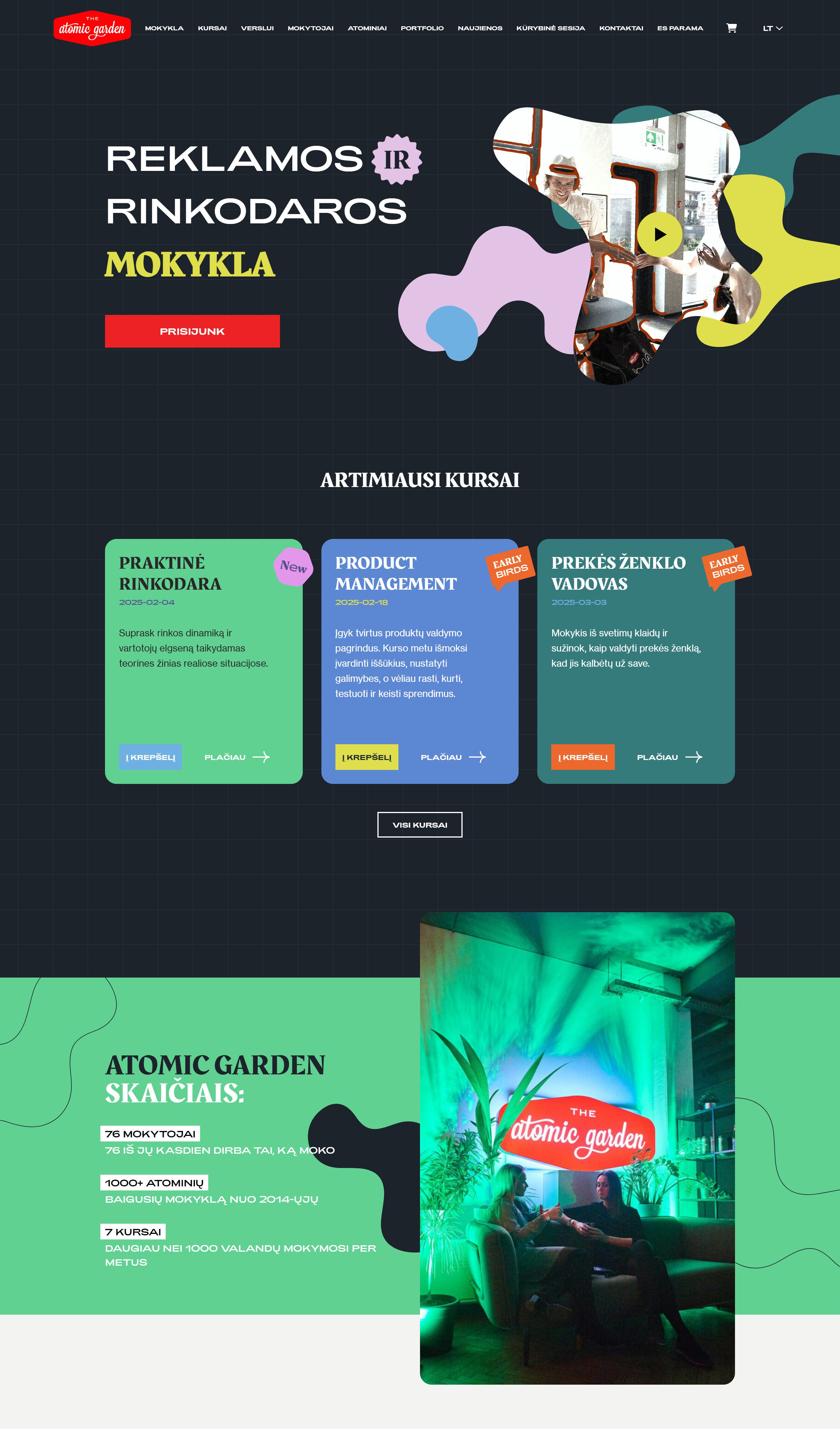 Atomic Garden yra reklamos ir rinkodaros mokykla, kur studentai įgyja praktinės patirties glaudžiai bendradarbiaudami su savo srities profesionalais. Mokykla siūlo kursus reklamos kūrimo, skaitmeninės rinkodaros, prekių ženklų valdymo ir vaizdo turinio gamybos srityse. Mes sukūrėme svetainę, atitinkančią Atomic Garden edukacinį požiūrį, suteikdami galimybę būsimiesiems studentams susipažinti su siūlomais kursais ir registruotis į juos.