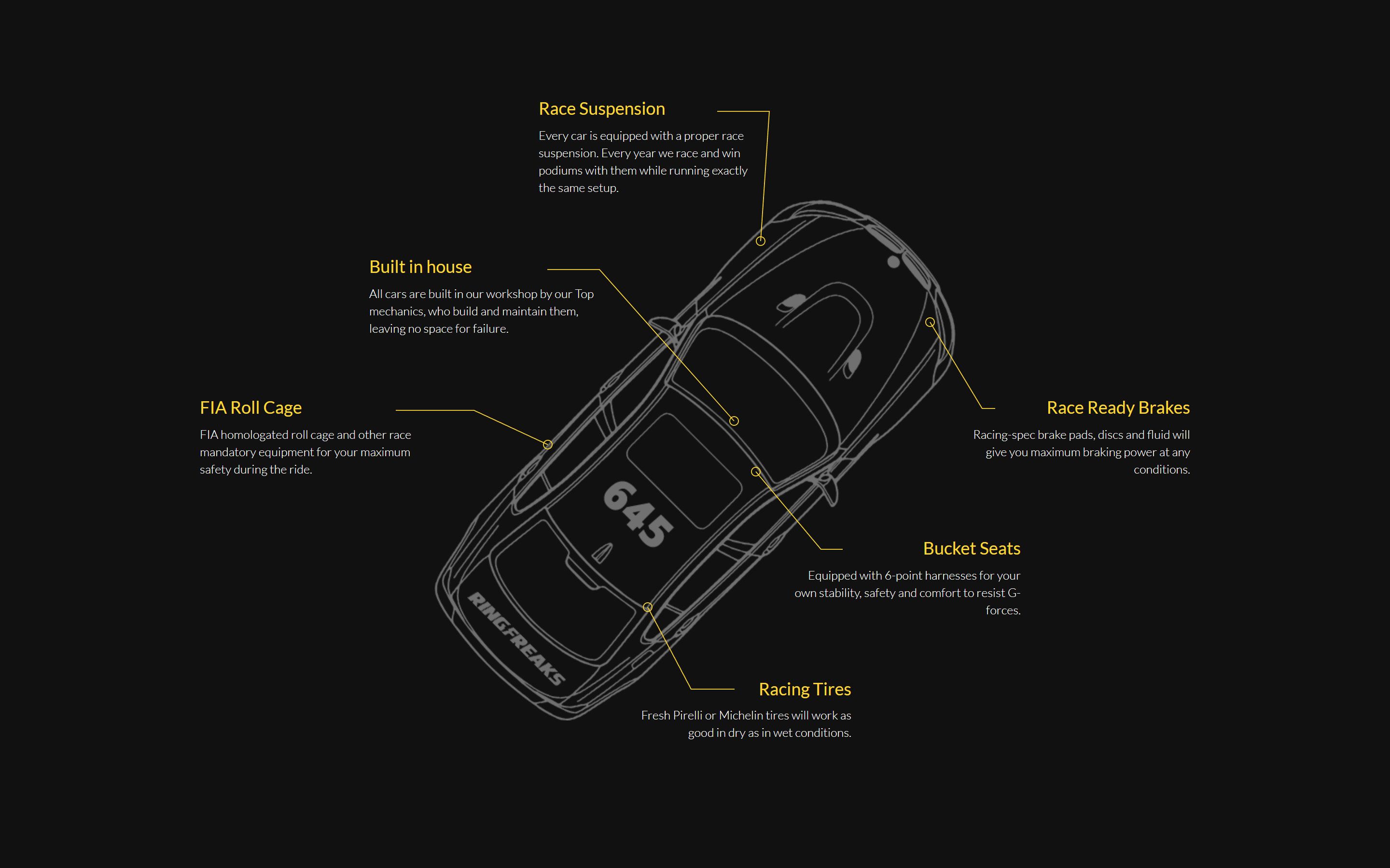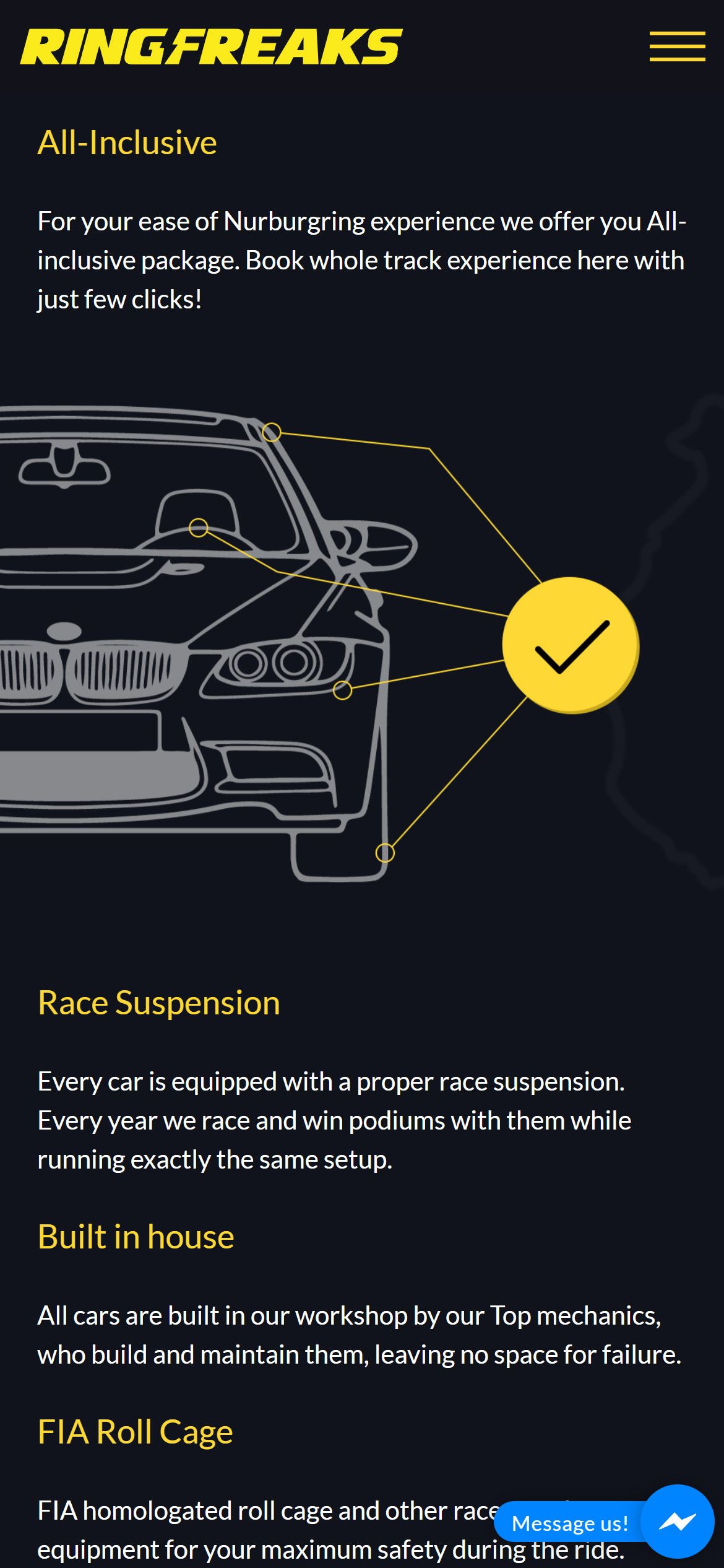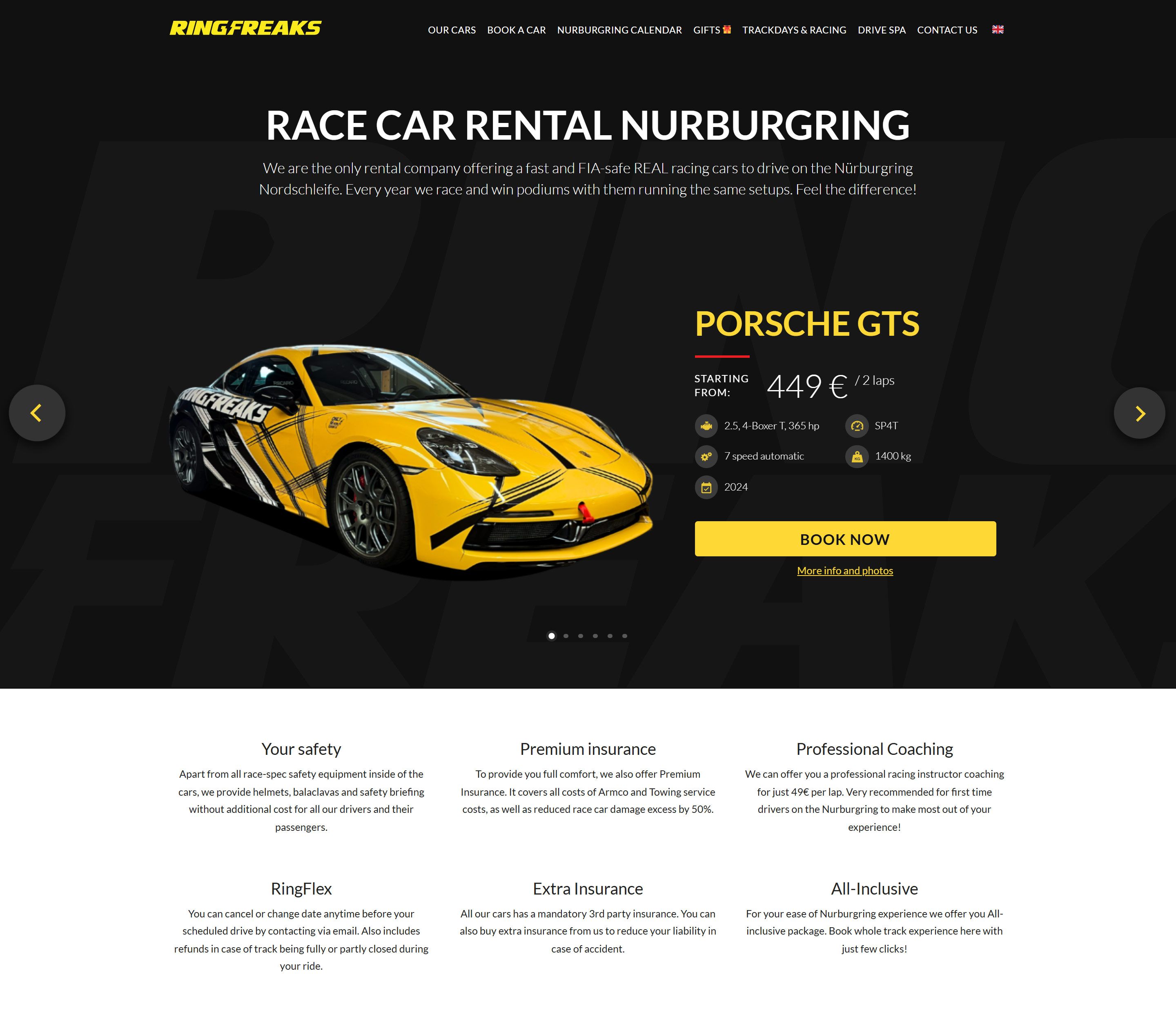 Ringfreaks automobilių sporto entuziastams siūlo prieinamą sportinių automobilių nuomą legendinėje Nürburgringo Nordschleife trasoje. Nesvarbu, ar klientai nori lenktyniauti, ar tiesiog pasivažinėti legendinėje trasoje autosportui rengtu automobiliu, Ringfreaks užtikrina saugią ir jaudinančią patirtį trasoje. Mes sukūrėme išsamią sistemą, kuri palengvina užsakymų, paslaugų ir automobilių priežiūros valdymą, užtikrinant sklandų procesą tiek klientams, tiek personalui.